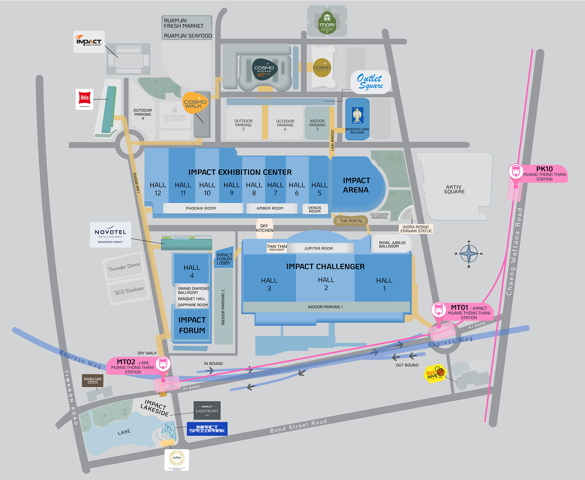 MT01 สถานีอิมแพค จะมีทางเชื่อมยกระดับลอยฟ้า (Skywalk) จากสถานีเข้าสู่ชาเลนเจอร์ฮอลล์ (สามารถเดินข้ามถนน มา Exhibition Hall ฝั่งตรงข้ามได้)